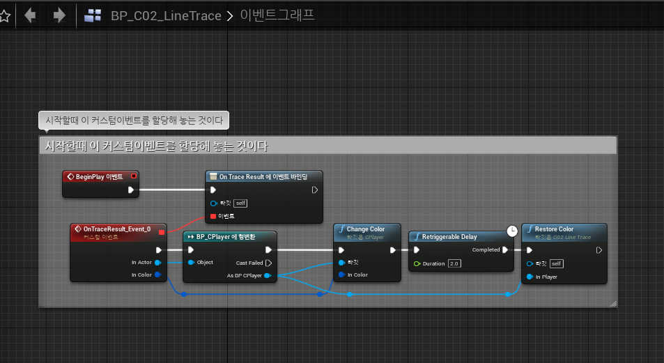 C02_LineTrance.h 내부 함수(StartJump)와 BP에 할당한 것이 같이 일어나서