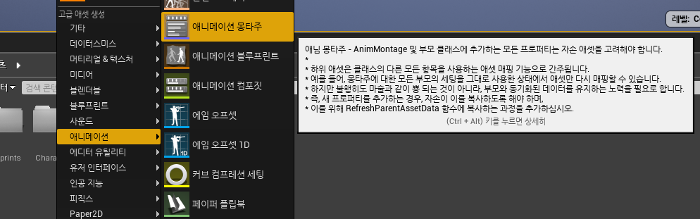 몽타주(Montage) 연속적으로 이어지는 동작이 아닌 한번씩 재생되는 동작들은 보통 몽타주로 제작한다. // Ex ) 공격 한번 ( 4타 연속 공격또한 몽타주 노티파이를 이용하여 만든다) 몽타주 생성 방