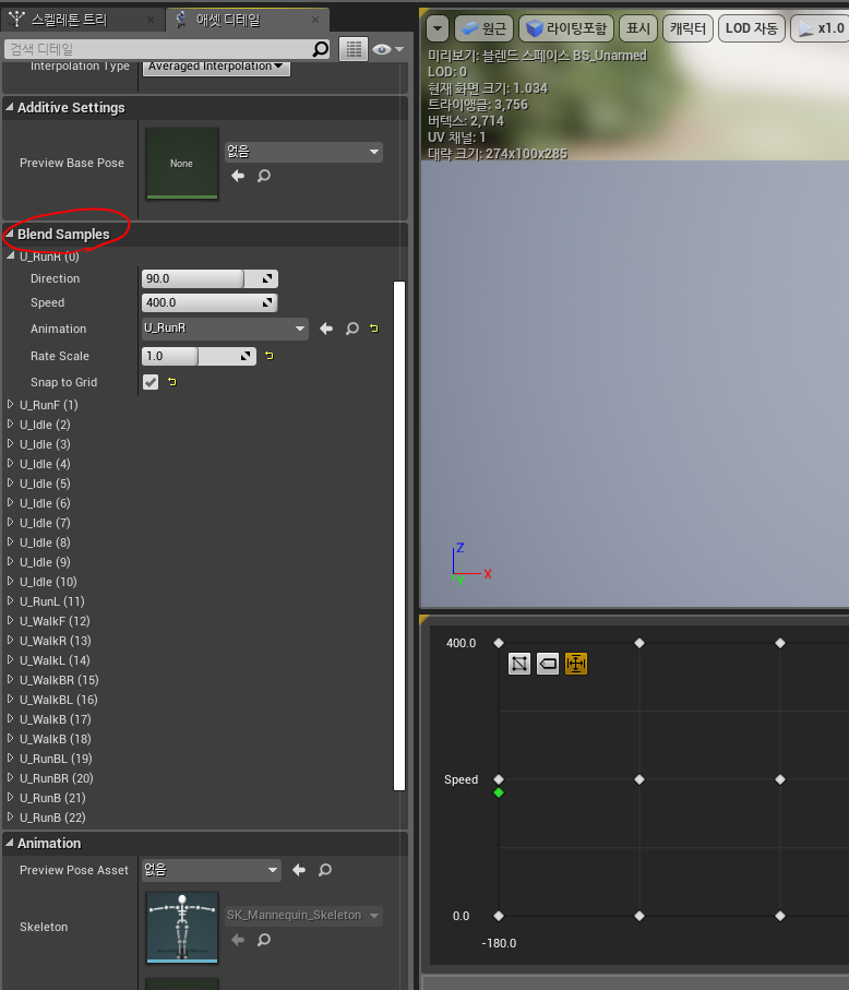 오른쪽 사진처럼 블렌드 스페이스 전체의 재생속도 또한 설정 가능하다.