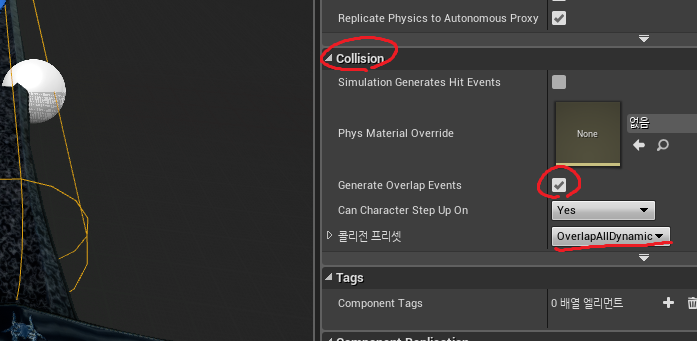 2. Capsule의 Collision 설정에서 Overlap Events를 사용하기위해 체크하고 콜리전 프리셋을 맞춰준다.