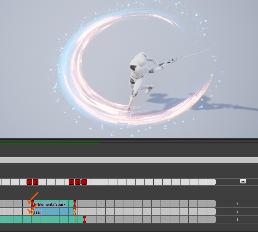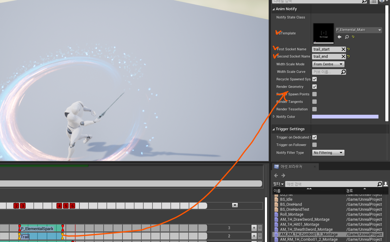 아래는 Trail 노티파이와 Timed Particle Effect 노티파이를 추가하여 애니메이션을 재생한 모습이다.