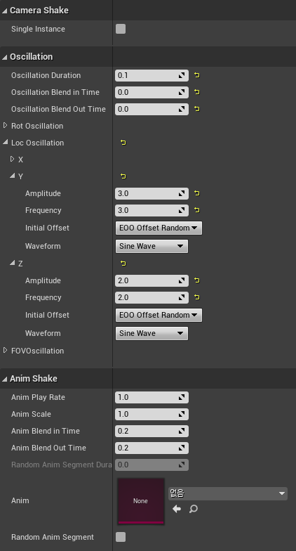 Single Instance : CameraShake을 여러 번 사용했을 때 ON 인 경우 하나, OFF이면 겹쳐 진동이 재생됩니다.