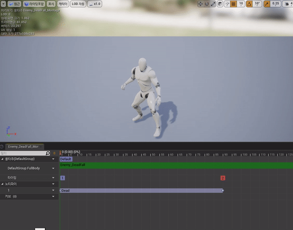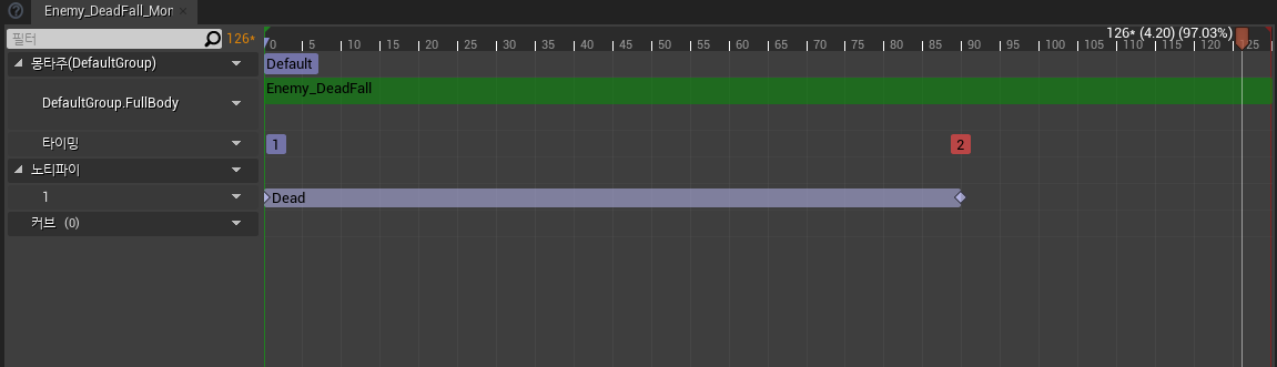 사망은 AnimNotifyState로 만들어 사망 시작시 충돌체를 모두 꺼버리고 종료시 사망 처리를 완료하도록 함