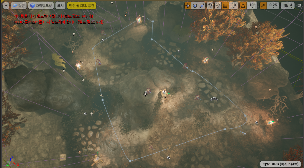 * BP_CPlayer의 FeetComponent의 Inverse Kinemetics에 DrawDebugType을 None으로 해서 디버그 그려지는 것 끔BP_CAIController_Wizard, Melee에도 DrawDebug를 꺼준다.