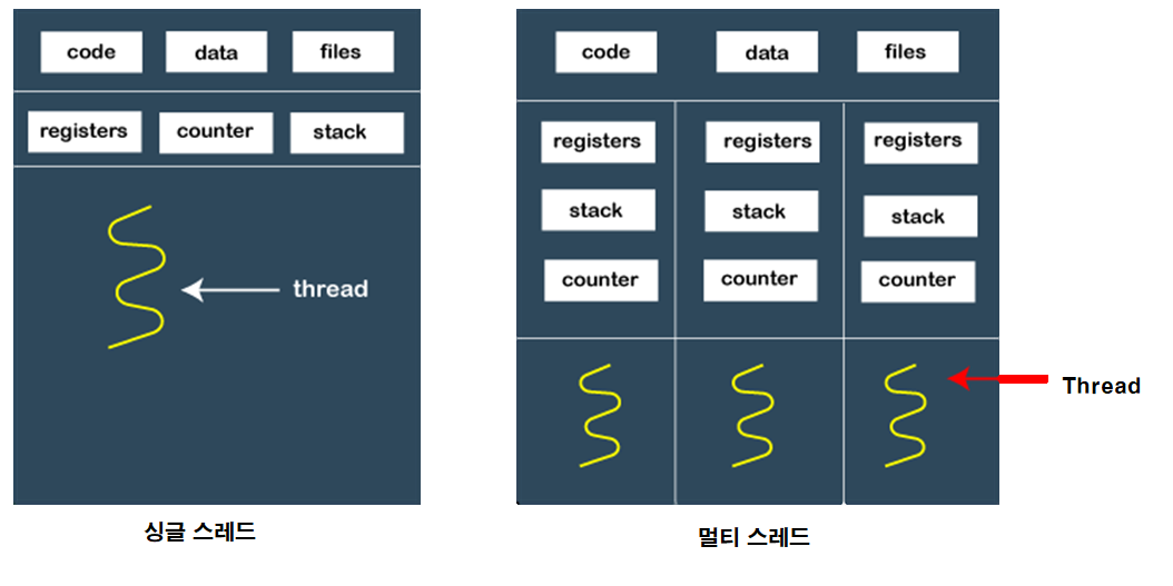 - 멀티스레드 프로세스 : 여러 개의 스레드를 가지고 있는 프로세스