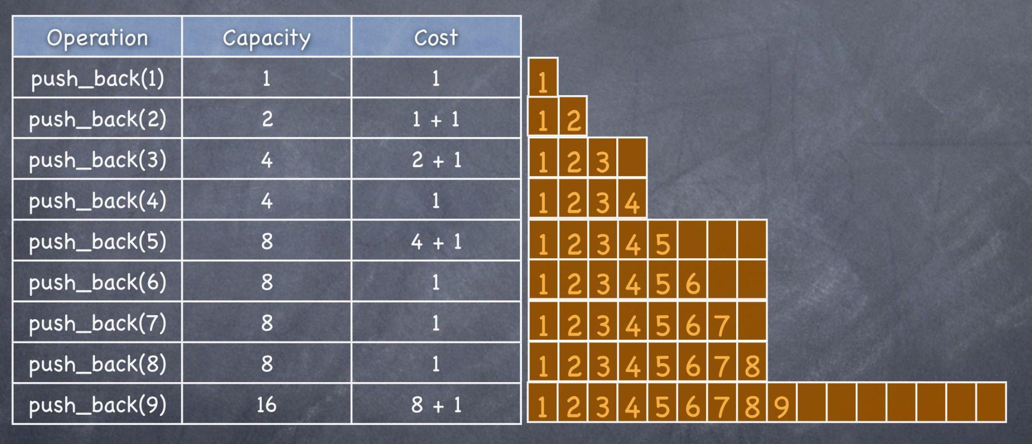 push_back()을 한다고 해서 매번 크기가 증가하는 것이 아니라 2의 제곱승+ 1마다 크기를 2배로 늘려짐.