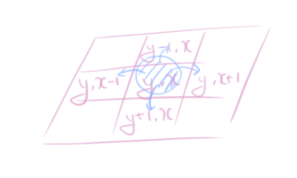 자 이렇게 하면 {y-1, x}, {y, x + 1} ... 를 구현할 수 있겠죠? 어떠한 y, x 좌표로부터 이부분에 대한 것을 +를 해주기만 하면 4방향 탐색이 완료됩니다.