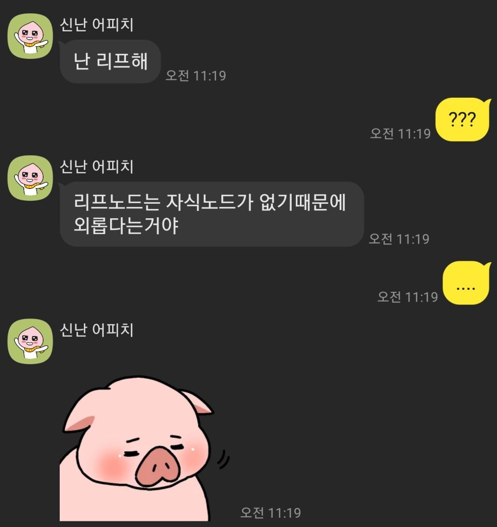실제 알고리즘 고인물과 카톡한 내용입니다. 아래그림처럼 리프노드는 자식노드가 없는 노드를 뜻합니다.