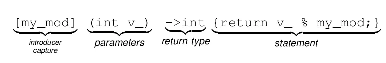 - [=, &x, &y] { /* */ }, 혹은 [&, x, y] { /* */ } 외부의 모든 변수들을 값/레퍼런스로 가져오되, x 와 y 만 레퍼런스/값으로 가져온다