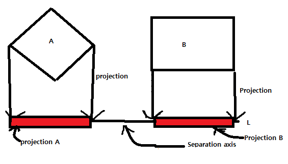 그렇다면 저희는 A박스와 B박스를 separation axis로 projection(투영)을 합니다. separation axis를 L이라는 벡터라고 가정하겠습니다. 투영할때는 가장 긴 가장자리로 합니다.