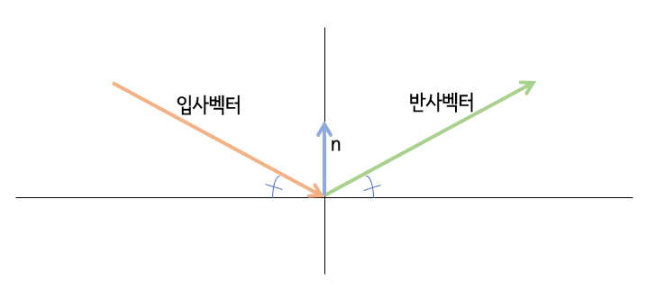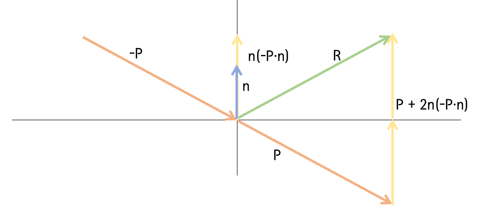 다음과 같이 입사벡터(P)와 법선 벡터(n)이 있을 때 반사 벡터(R)은 입사벡터(P)와 크기가 같고 반사각과 입사각이 같다.