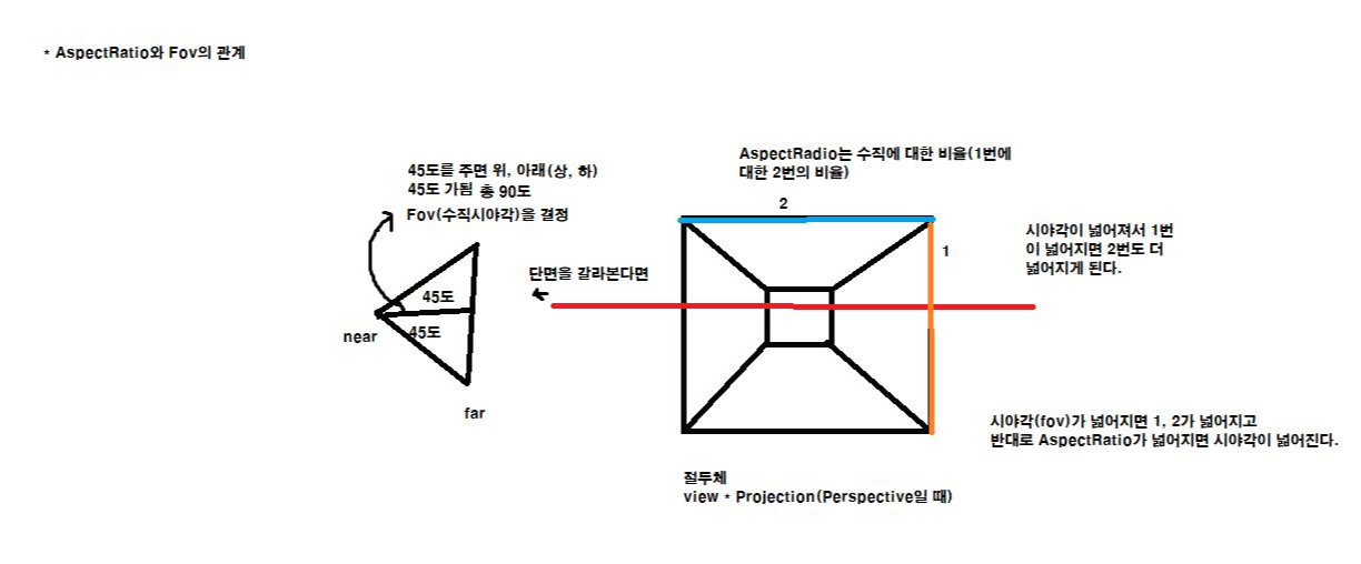 Aspect Radio를 1:1로 주고 FOV를 90도로 준다면 직교 투영과 같은 모양이 되지만, 원근감은 그대로 유지된다.(평면에 가까운 모양이됨)