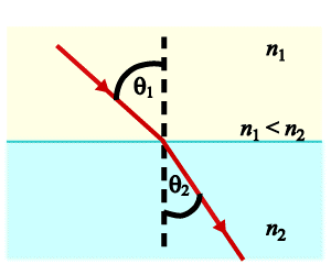 | 1.속도가 떨어진다 = 남다(파장의 길이)도 줄어든다. 2.법선에 붙는다.(굴절 광선이) 3.굴절각이 작아진다. |